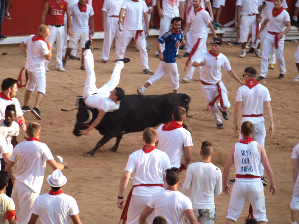 Early each morning, armed with my camera, I staked out a different spot along the route, perched on a fence or behind it, to watch the death-defying run of daring, foolish risk-takers chased by bulls running in a well-defined chute to the arena. One morning, I was invited to join friends of Nuntxi on their balcony overlooking the course, with drinks and hors d’oeuvres, as we were regaled with stories of past runs by her friend who had participated for years in the event. There were some serious injuries and casualties that year when the runners and bulls reached the arena, where the entrance narrowed.