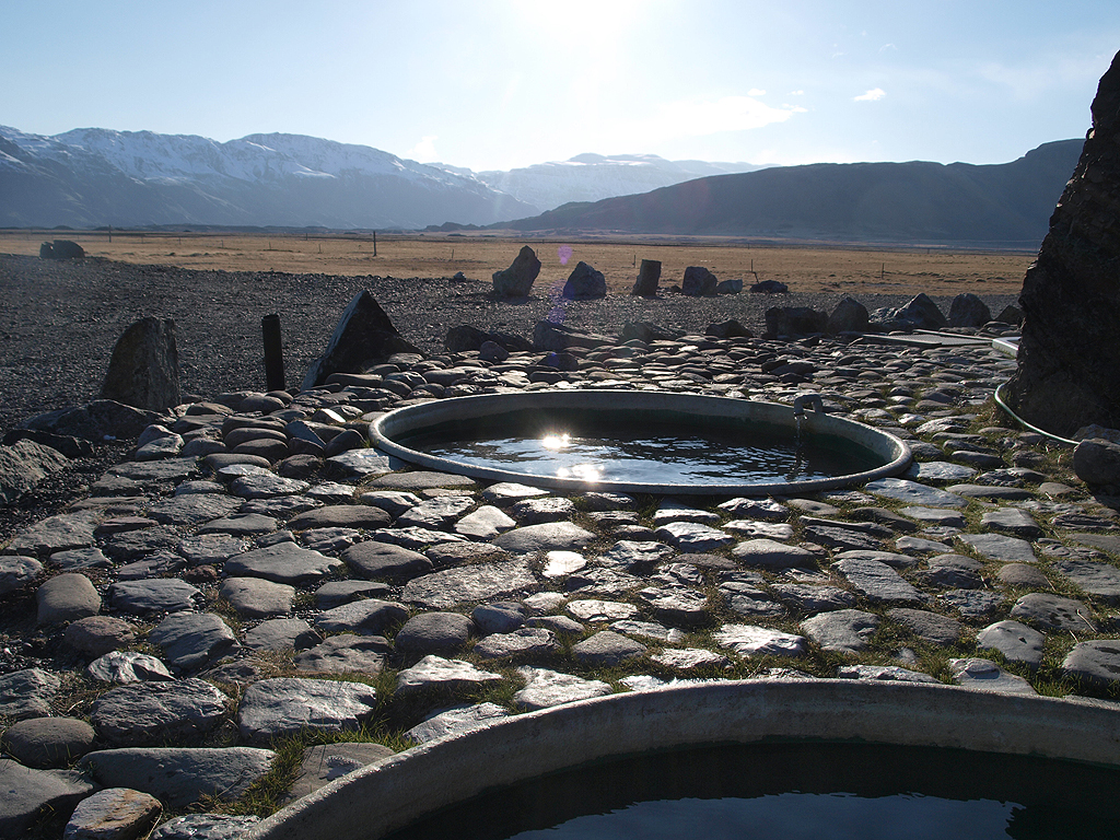 As one might expect from an island nation, water is the stuff of which nature and landscape is formed, but in Iceland it tends toward the extreme and dramatic. Massive glaciers blanket the mountain ranges of the inland center. Geothermal mudpots bubble and steaming geysers reach to the sky. Icebergs float in frigid lakes surrounded by snow-topped peaks. Naturally heated sundlags—hot springs and swimming pools—are gathering places of warmth. Hot water comes out of the faucets, environmentally designed to take advantage of the intense temperatures of Iceland’s underground natural resources.