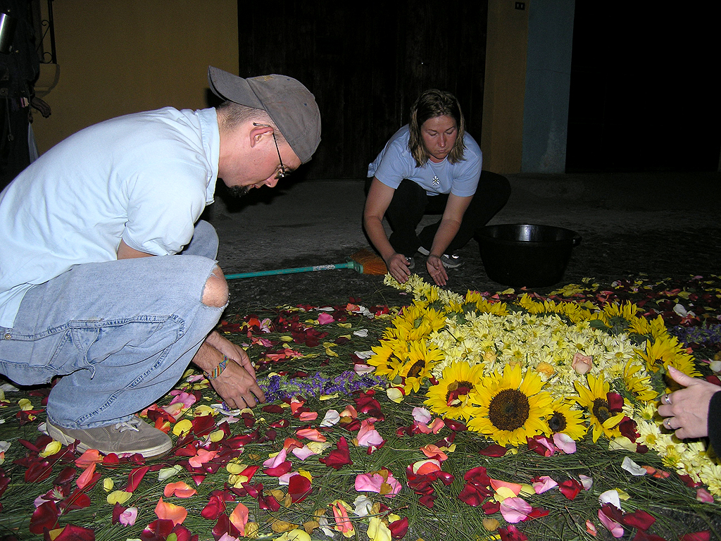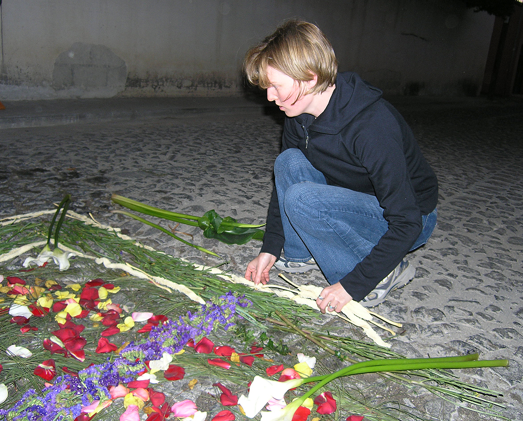 I arrived in the afternoon, two bouquets of flowers in hand, in time to meet friends returning from town with overflowing armfuls of blossoms. We scattered to find water buckets, baskets of chips, and wine bottles. Taking stock of our ingredients, there seemed to be a preponderance of yellow, so someone suggested we create a sun at the center. Michael and Anita, art teachers, organized ideas for a carpet design, using the sun as a focal point. We each drew a variation before heading out to dinner and Michael, selecting elements from our drawings, merged them into a workable design. Walking back to Burrito late at night after dinner out, we observed many locals already hard at work at carpet construction. Sawdust carpets could be laid the night before; floral creations would be fresher in the morning.