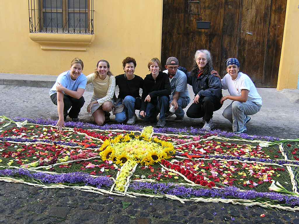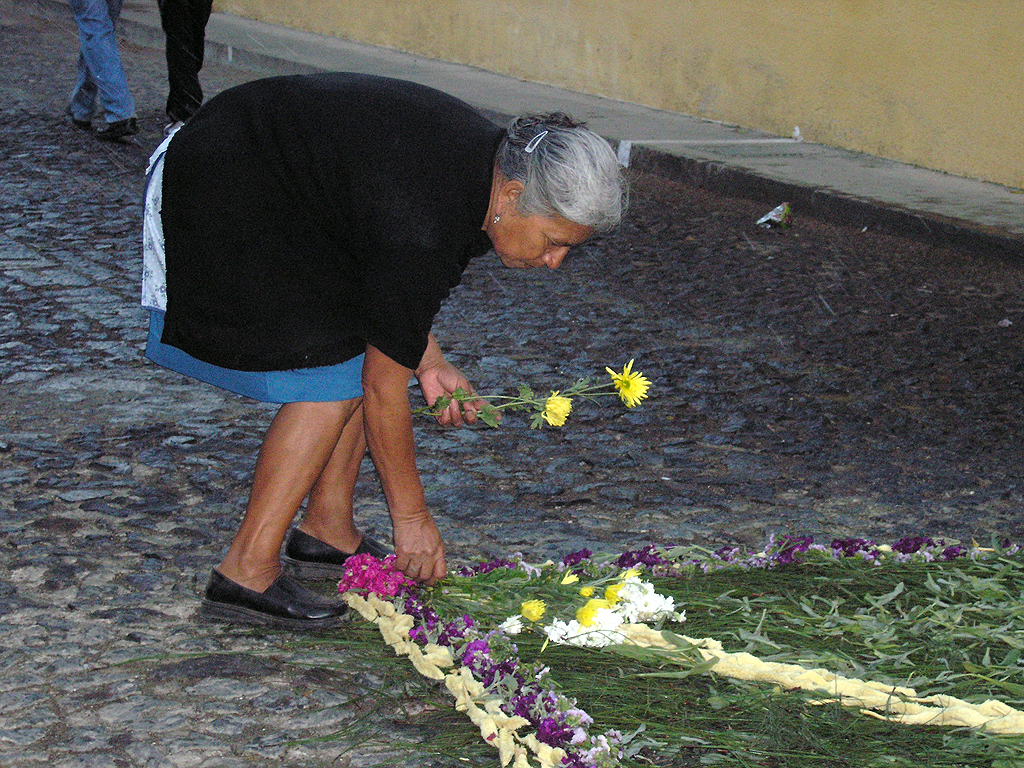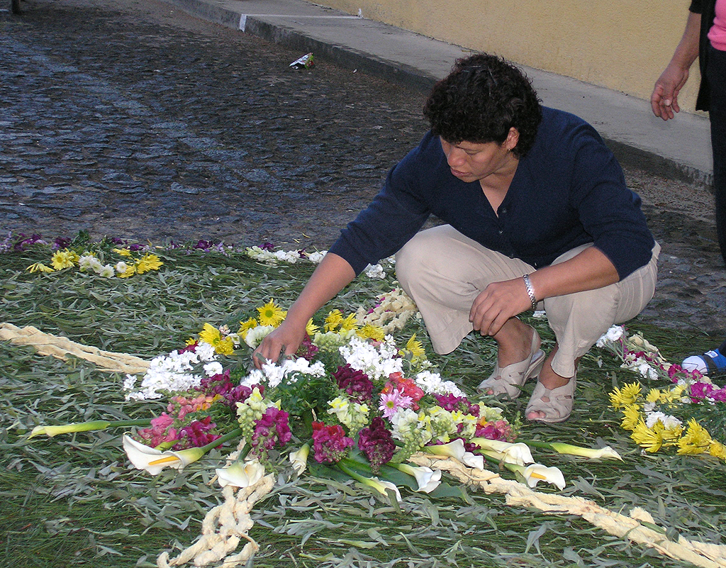 At five a.m., we rose, downed some coffee and pastries, and carried the flower buckets, along with other essential tools, out to the street. After hosing down the cobblestones, the first layer was a bed of soft green pine needles. Then the yellow sun emerged, circled by sunflowers, each design growing slowly like a blossom opening. Some of us cut flowers or pulled petals. Even the greens could be used, some as outlined rays emanating from the sun, others as a soft background of rose petals. A long brown pod was cut open and the wheat-like seeds inside were used as a border. The neighbors next door, three Guatemalan women, were building their own alfombra at the same time. We admired each other’s progress, and appreciated their suggestions. As the sky grew light, as if building to a crescendo, we finished our mission. We sprayed the carpet with water again to keep it moist and fresh-looking, giving it life for just a few more hours.