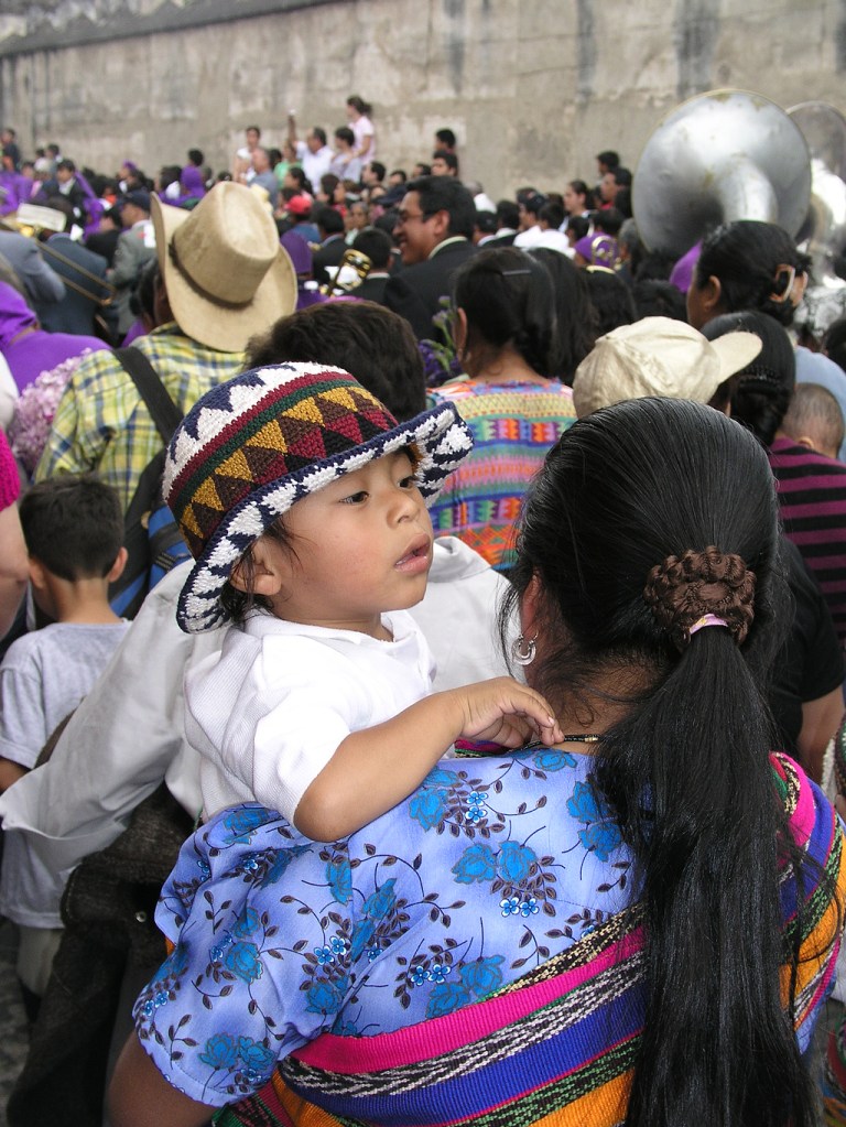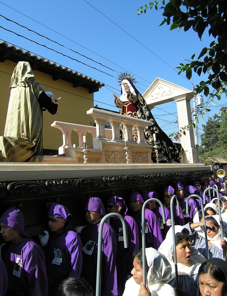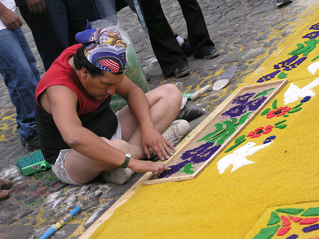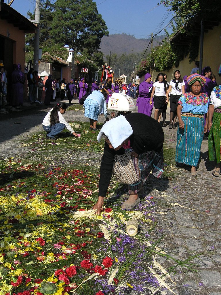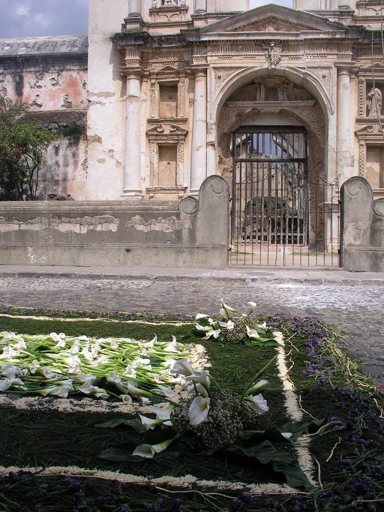 No one celebrates Easter the way Antigua, Guatemalans celebrate Semana Santa, Holy Week, with rituals that date back to old Spain. Magnificent, ephemeral festival art comes to life and is lovingly trampled. Along the streets, people cluster in groups around artists creating beautiful but fleeting works of art in the form of carpets on the cobblestone streets. Some are made of painted sawdust sprinkled through stencils fashioned by local craftsmen, or artistically composed from the tiny grains of wood. Others are made from fresh and dried flowers, many with elaborate images or Mayan patterns. Some are more striking for their simplicity: one consisted mostly of fresh white lilies with long stems, another a mat of pine needles with small bouquets at intervals around the border.