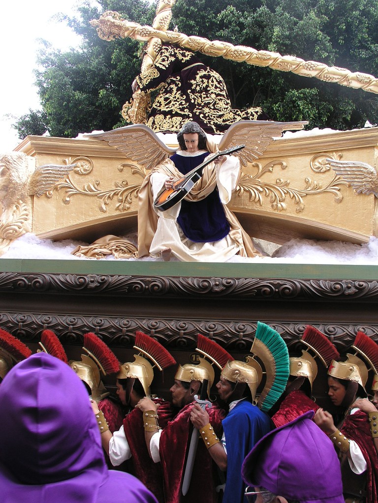 When the first float approached, we assumed our positions to watch the procession, excitedly awaiting the ceremonial destruction of our morning labor. Purple-gowned guards formed a barrier along the edges of the road, keeping spectators back. A series of marchers came slowly by—a cadre of Roman soldiers; men gowned and hooded in red, hoods reminiscent of those used by white supremacist groups in the States but designed from costumes of ancient Spain that had no such connotation. Incense bearers dispersed heavy smoke among the marchers, the thick atmosphere adding to the mystique of the day.