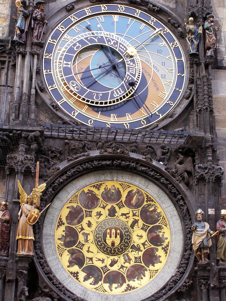 I often wandered the twisty streets lined with historic European architecture. Cobblestone streets and sidewalks winding in the canyons of ornate buildings in StarΓ© MΔsto, the Old Town quarter of Prague, opened up to the wide L shaped Old Town Square. Around one corner, marked by a crowd of tourists with uplifted faces, hung the famous astronomical clock, affixed to the Old Town Hall tower. A series of revolving overlapping circles in blue and gold represented the movement of the sun, moon, and planets, as they were understood when the clock was created five hundred years ago. A brown and gold circle underneath the clock depicted pastoral scenes, saints, and zodiac signs around a castle at the center. Symbolic figuresβa skeleton, an angel, and othersβstood by the disks, evoking the forces of life, the spirits that protect, threaten, guide. On the hour, two doors opened above the clock, allowing twelve beautifully carved apostles to emerge; they paraded by, each pausing to look out at the crowd below, who looked up at them, their faces rapt.