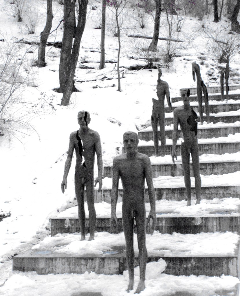 Karlov Most, the Charles Bridge, the king of bridges, reigns in the center of Prague. Dark statuesβhistoric, religious, artisticβmark its edges at regular intervals, watching over the multitude, blessing or threatening, peaceful or bellicose, some with golden halos, others with outstretched arms and knobby fingers; pigeons perched on their heads and streaked their shoulders, as if ridiculing their pompous poses. The bridgeβs sturdy promenade was a lively place to walk, crowded with tourists, buskers and vendors; no cars allowed. Musicians played and stalls offered jewelry, postcards, t-shirts, beaded bottles and pillboxes, toy-sized pastel buildings, and miniature astronomical clocks. Beggars humbly knelt on the ground face down, seeking no eye contact, crouching at the feet of passersby, hat extended in outstretched arms. Local artists displayed photographs and watercolors; I was drawn to the ones of the bridge at dawn, when no one was around, the statues appearing in shadowy shapes obscured by fog. One morning, I was able to capture that image myself.