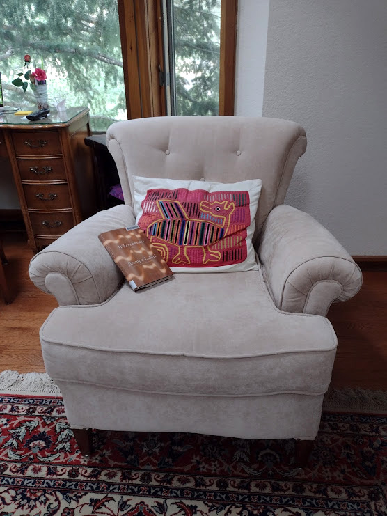Sitting in the stuffed, upholstered chair that I grew up in, reading now as I did as a child, curled up in the chair, I am sad that my parents are gone, but pleased to have rescued this chair from my childhood. I had it repaired and recovered a few years ago by a skilled friend.