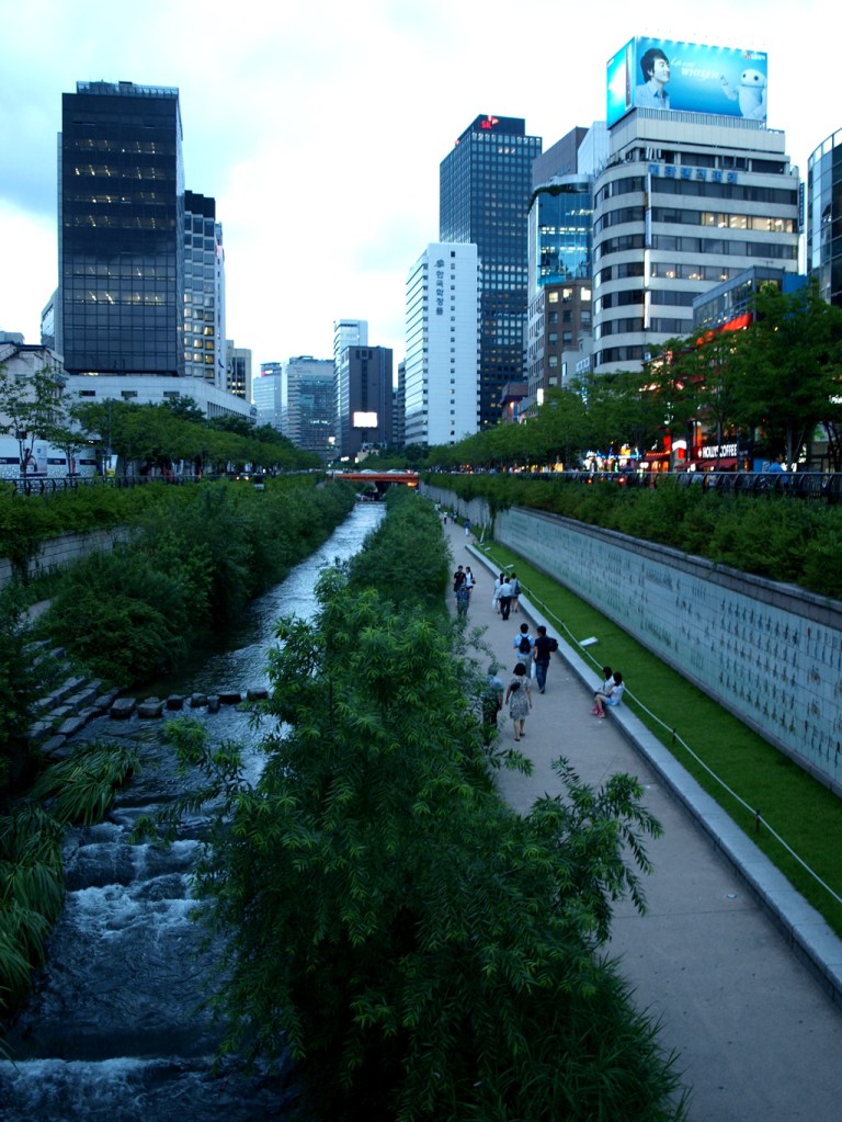 Changdeokgung Palace had elaborately painted wooden beams in pinks and greens under curved tile roofs. I could envision the royalty milling about in their boldly colored gowns adorned with fine embroidery. We weren’t allowed to enter the Secret Garden without a guide and missed the Japanese and English tours, so we opted for the next available, Chinese. It was a nature hike through dense forests with small, humble yet gracefully roofed and painted buildings. In the city center, a popular path along the Cheonggye Stream led to night-lit waterfalls.