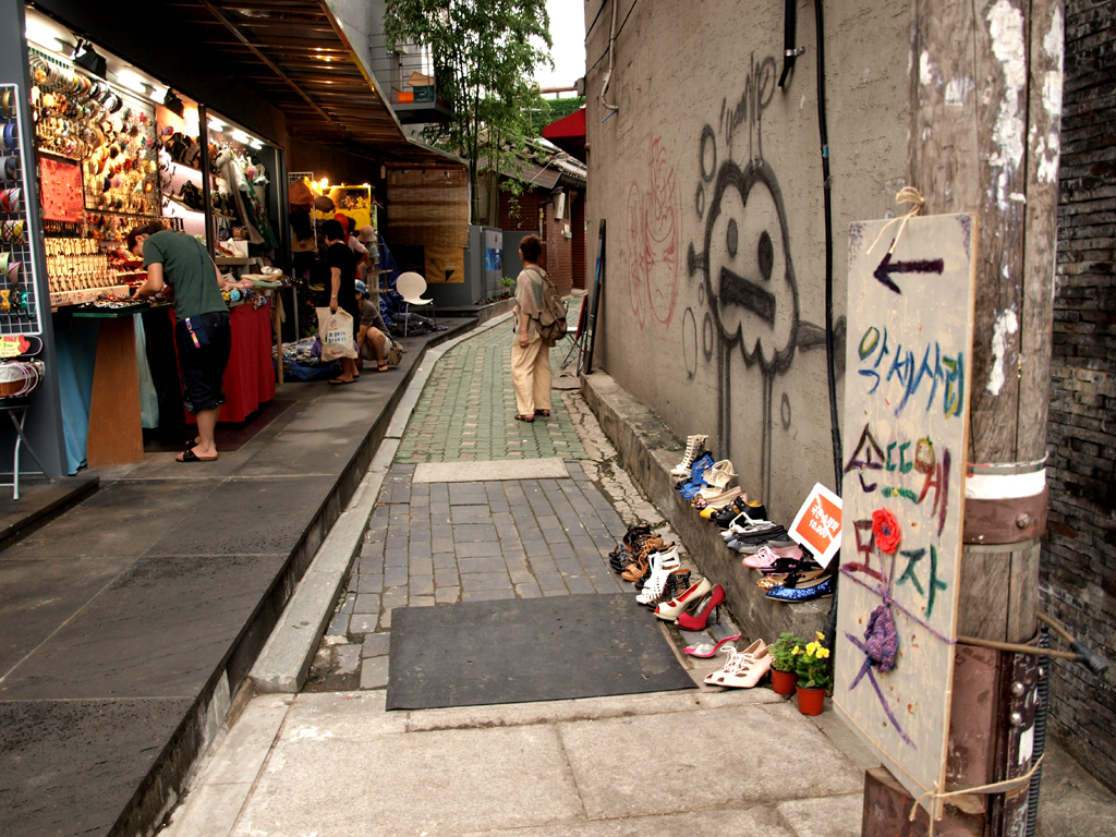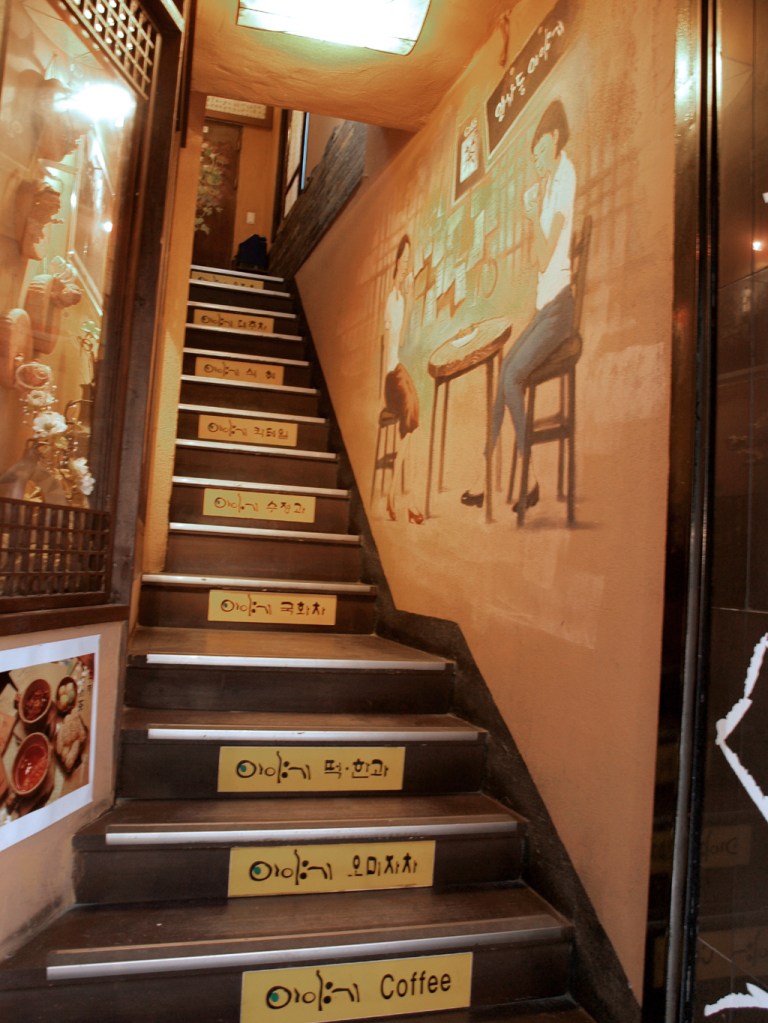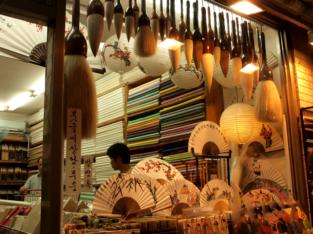 The Insa Dong neighborhood in the heart of Seoul was vibrant with activity: tiny shops with gifts in vivid primary colors, goods in bins on the sidewalk, the smell of food from street stalls around every corner, textured handmade paper hanging on racks, tea shops, young couples, tourists, and just life. I was traveling with a Japanese friend, and our little hotel was right in the middle of it all.