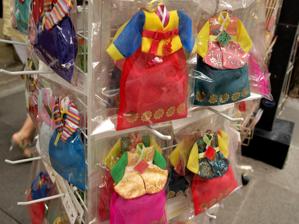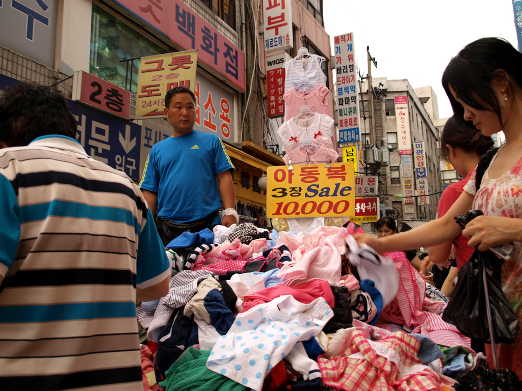 The markets were endless – blocks after blocks of shops, in covered buildings, out on the streets, in carts or on blankets. Dongdaemon market branched off into dark alleys, barely enough room to walk, and difficult to negotiate around passing carts being pushed or dragged. At Namdaemon market, clothes were piled high on tables. Often the seller perched in the middle, on top of the table, throwing items to the women who were rummaging through the pile.
