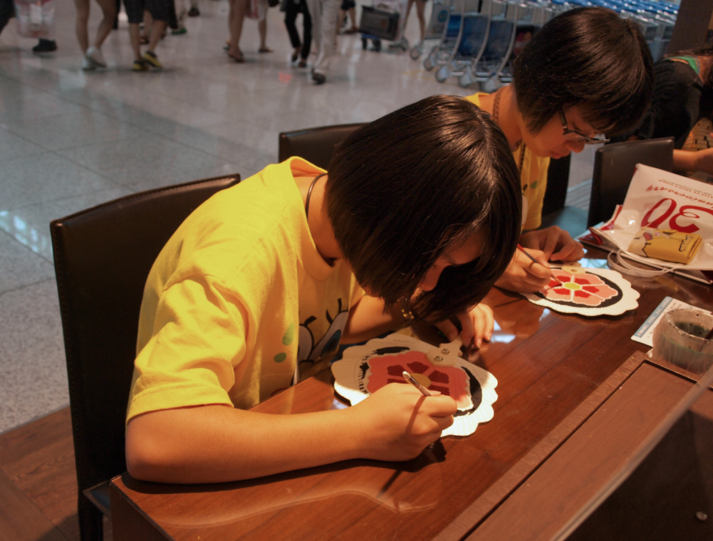 On our last night in Seoul, we went to a spa. I’m sure the masseuse scrubbed off a layer of my suntan. I sweated in a charcoal sauna, was smothered in a cucumber facial, coated with mud, had a rough massage in oils, and soaked in a ginseng hot pool. At the airport, one could paint their own fan, roughed in with traditional shapes. I still have mine.