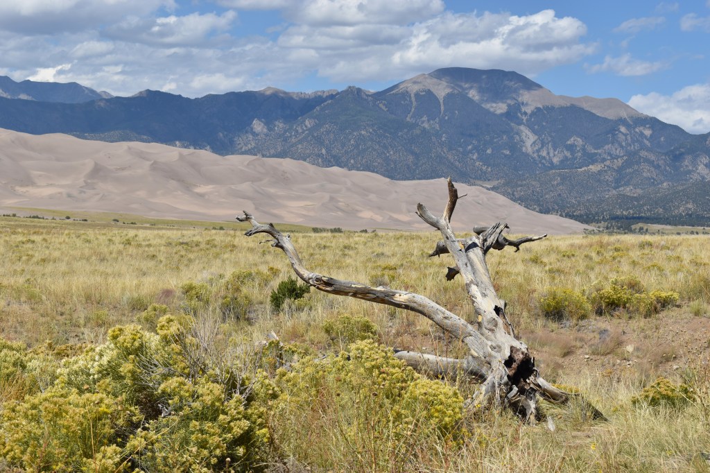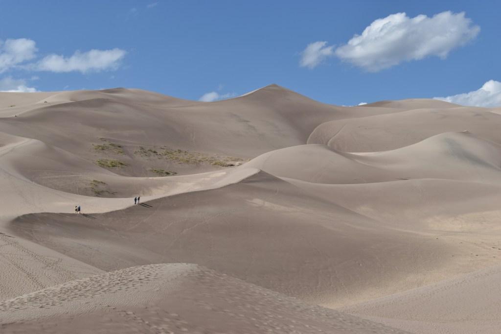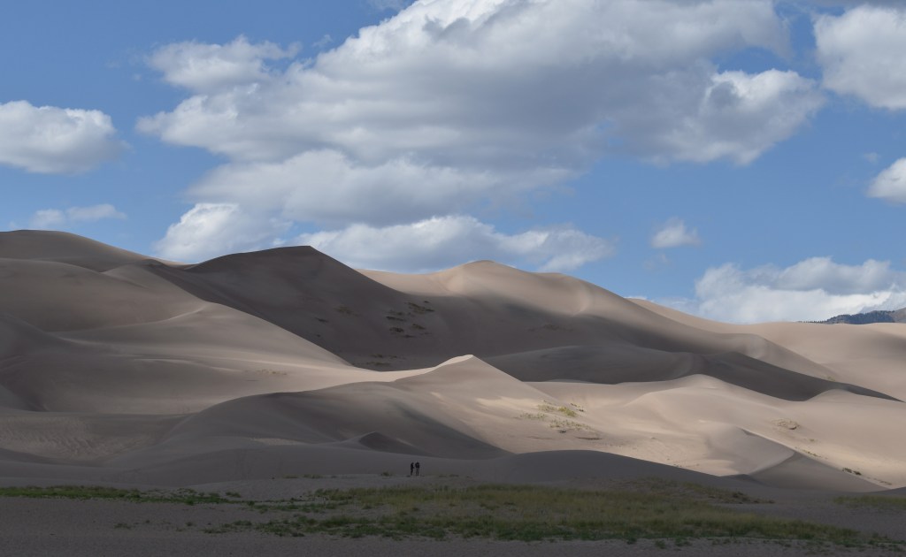 As the wide San Luis Valley opened up, the desert landscape painted yellow across the valley floor. The pale shapes of the sand dunes rose up against the eastern mountain range. The dunes were formed by sediment from the surrounding mountains that settled in the valley. Southwestern winds blew the sand up against the Sangre de Cristo range over thousands of years. The peaks and valleys of the dunes are always shifting with the seasons and the winds.