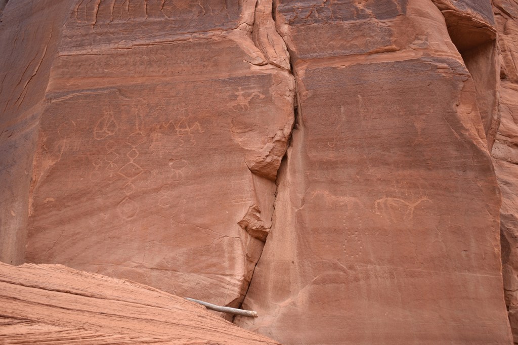 The photos in this post were taken from the canyon floor during that jeep ride, amid the shapes sculpted by water and wind. In the afternoon, I took the South Rim drive looking down into the canyon. In some cases, I’ve shown a broader view of where the petroglyphs appear and then a closer look.