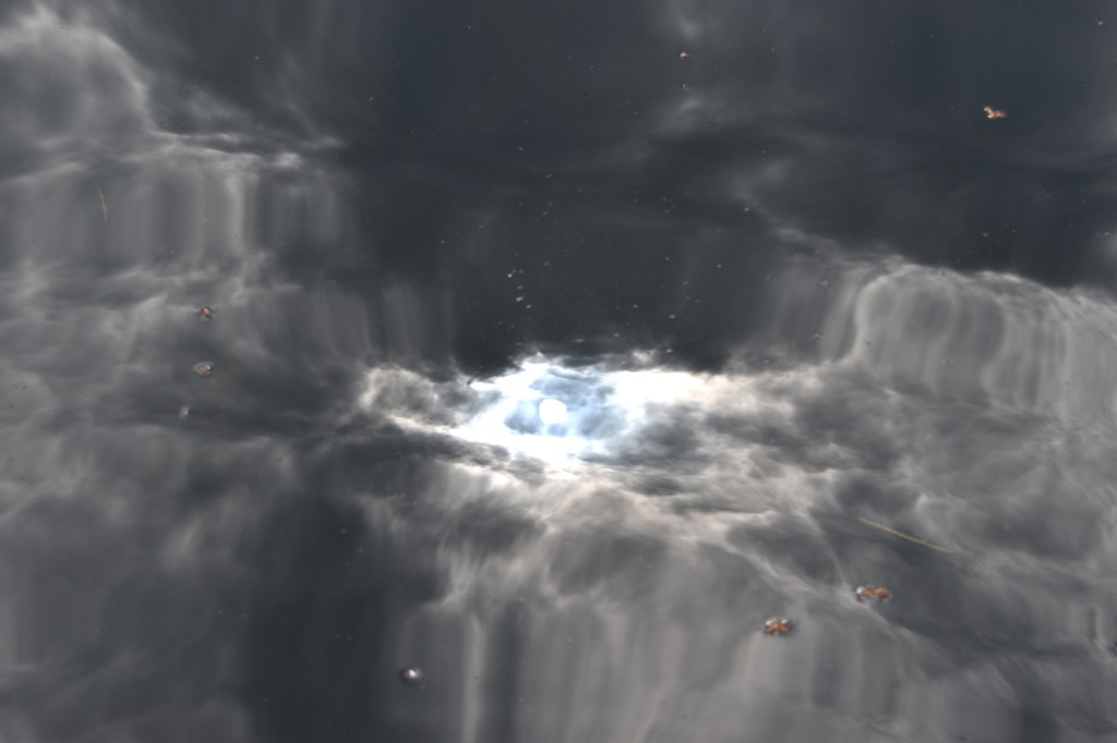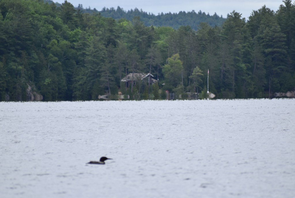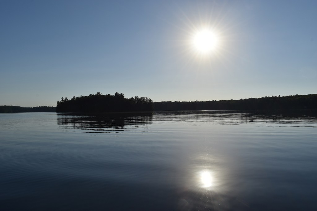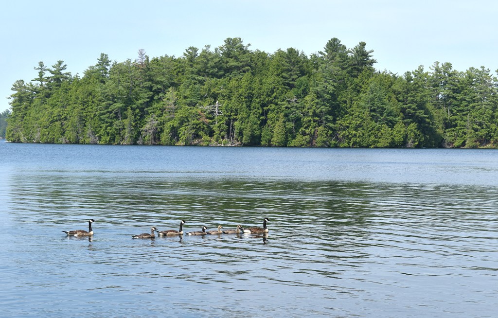 Listening to the gentle breeze rustling the tall trees. Cool in shadow, where I sat, the blazing sun made its way across the sky in echo, its reflection kept pace across the softly undulating waves, light sparkling on the surface of the water. A brief commotion of geese calls, something they suddenly needed to argue about or call to each other before taking flight. Goslings followed their parents, drifting by in a line. Shadows of the leaves speckled the deck as the sun and wind moved through them. My brother pointed out a loon further out on the water. The smell of fresh lake water and its choking green plants reaching up under the surface.