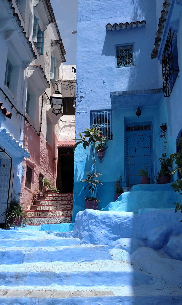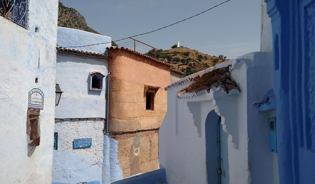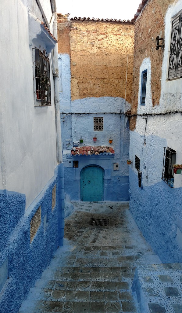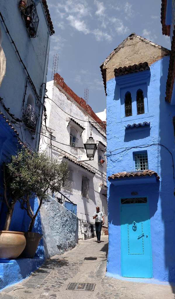The bus from Tangier to Chefchaouen (2018), also called Chaouen, takes about two and a half hours. Nestled in the Rif Mountains, it’s been called one of the most beautiful towns in Morocco. It’s also been called a typical Berber village, and is sometimes known as the “Blue Pearl.” Founded in the 1400s as a military post, it was settled by Spanish and Portuguese, and became a refuge for Jews and Andalusian refugees fleeing persecution in Europe.