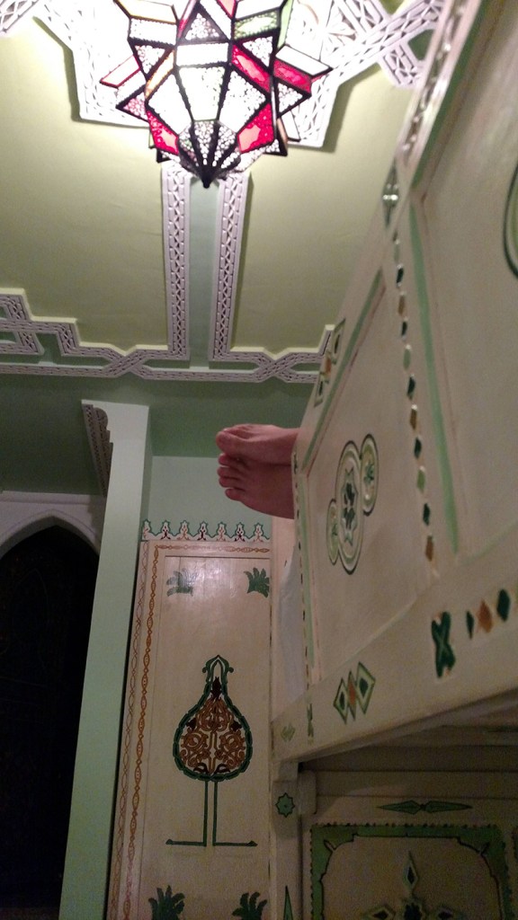 Our riad, Dar Aldea, climbed up the side of a mountain. At the top was a view of the town and landscape, a breakfast nook, a laundry spot, and a wonderful place to relax. Breakfast was served in many tiny plates. Our room had bunk beds; my son’s toes were visible above me.