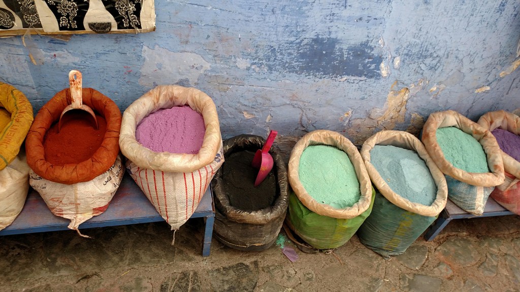 Your pictures of this charming town are so lovely. Blue is actually my favourite colour. Some of those spices have some unusual colours. I wonder what the pink one is.