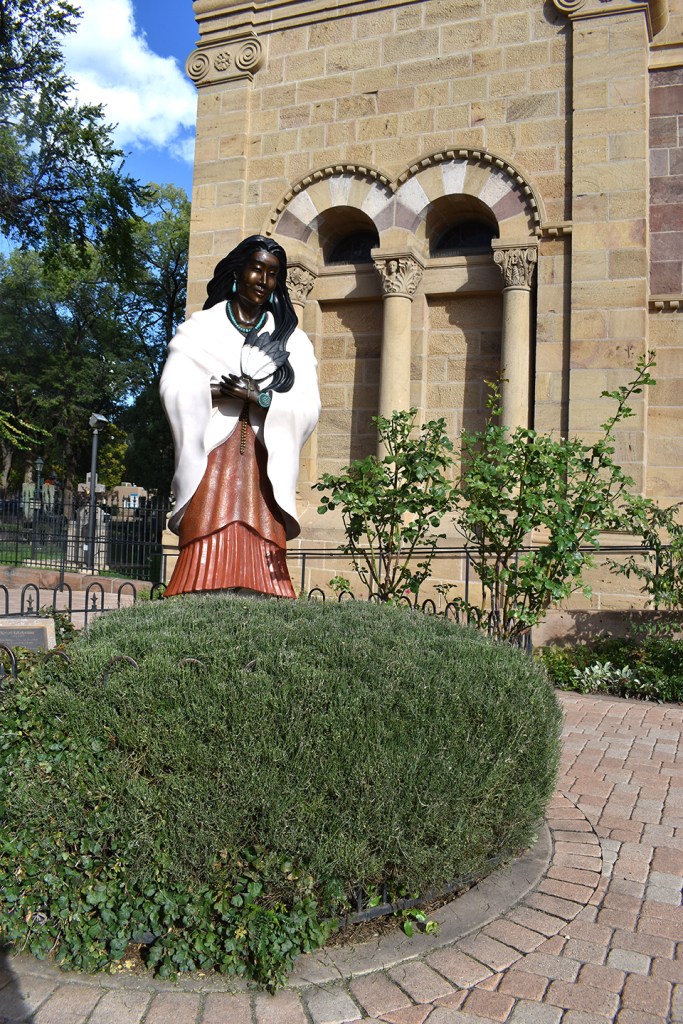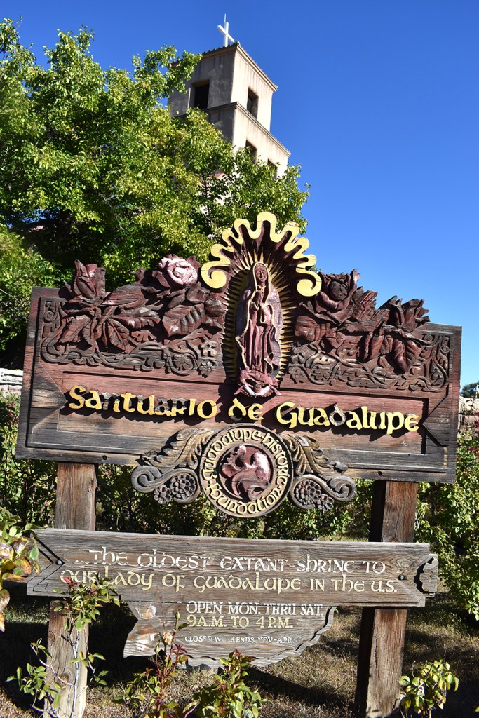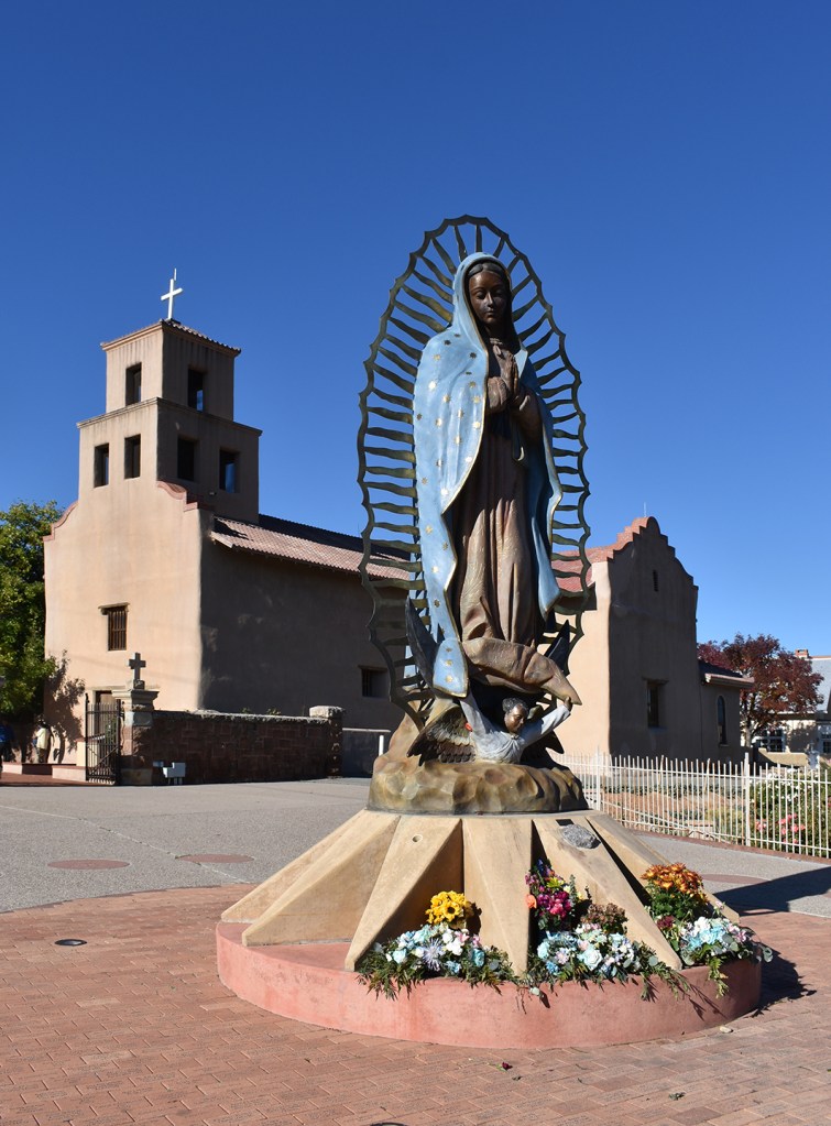 Just a few blocks south of my inn, a short walk down Guadelupe Street, stands the iconic sculpture at Santuario de Guadelupe. Opened in 1795, she is listed on the New Mexico State Register of Cultural Properties. Our Lady, a lovely dark figure, draped in a light blue cape studded with stars, a patch of sky that has come down to envelop and caress her, is obviously a beloved fixture. At her feet were bouquets of fresh flowers, probably replaced daily.