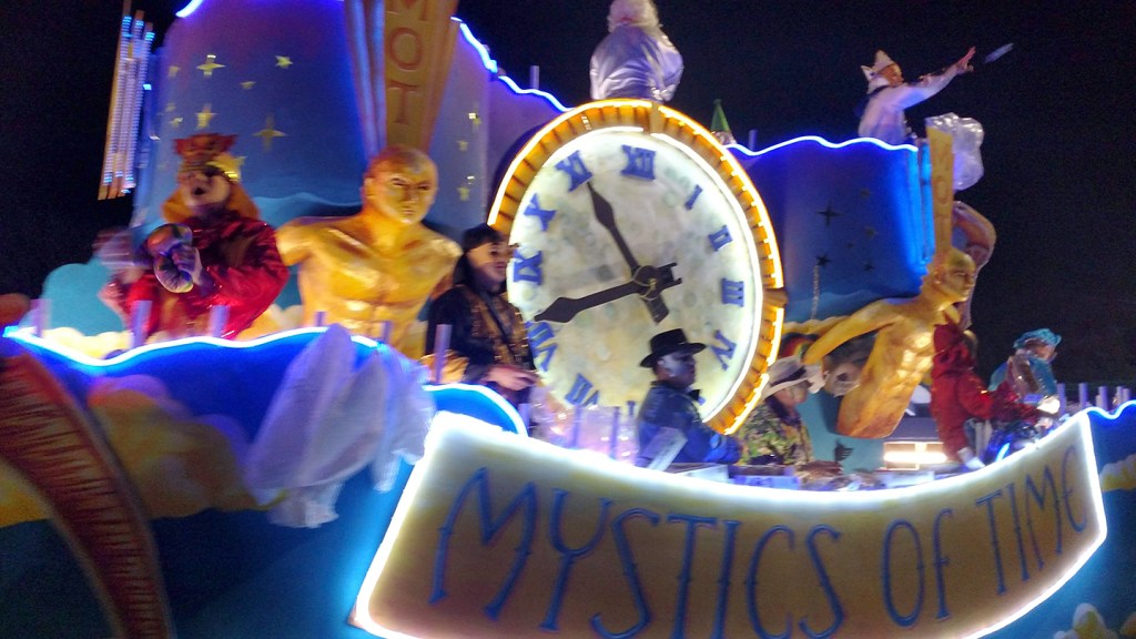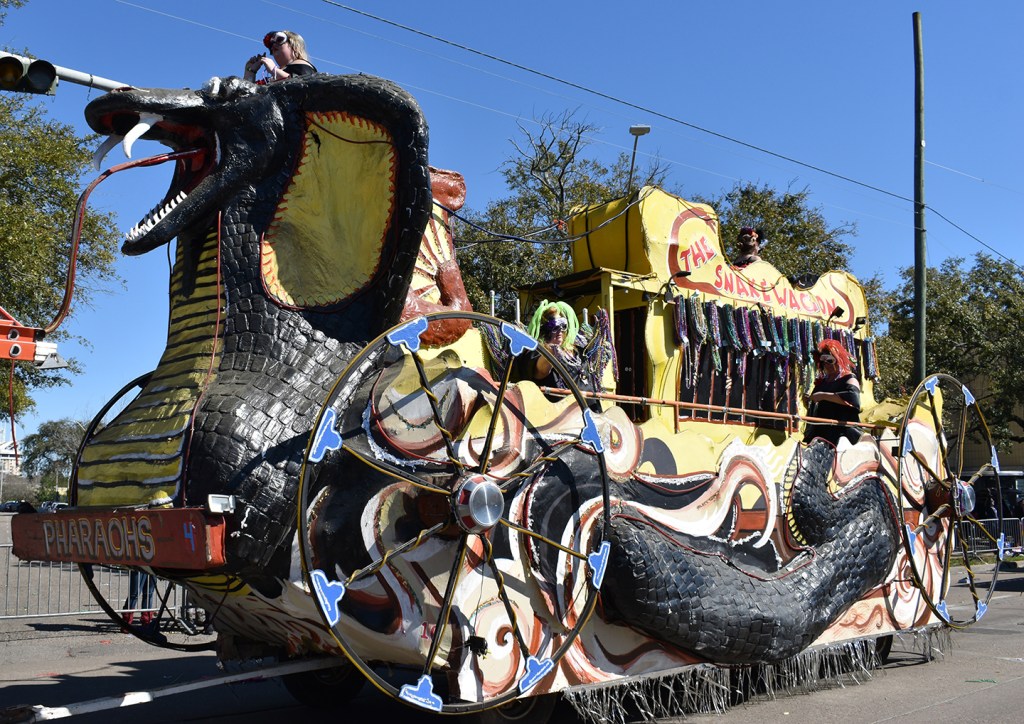 Mobile on Saturday turned out to be a good choice. Sunday’s festival in Mobile was themed in honor of the originator of Mardi Gras, Joe Cain, who dressed to ridicule Native Americans and honor Confederates, we learned. But Mobile was a welcoming city—downtown Dauphin Street with its sidewalk tables and bars, friendly fellow parade-watching families, and the best of the floats we saw all weekend. The parades started at noon and lasted into the dark of night. Our destination “krewe,” the Mystics of Time, included fantastical dragons, Dr Who’s Tardis, Father Time, and more characters and constructions than I could identify.