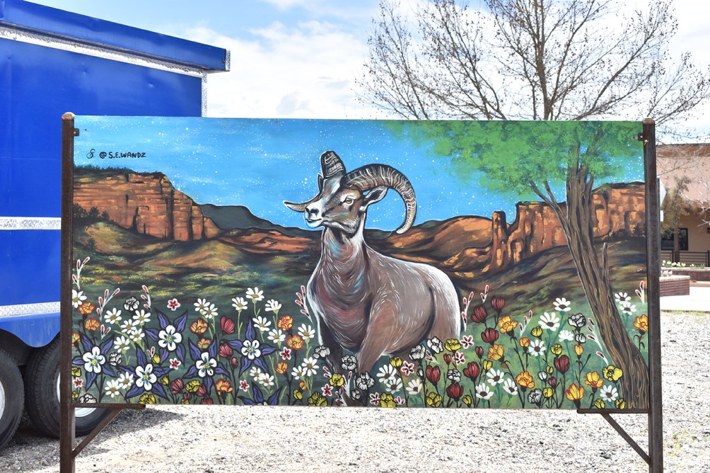 Rather than drive over the mesa, where the roads are winding, steep, and were still snowy in mid-April, I drove west on the interstate highway, turning south at Grand Junction. The city is named for the confluence of the Colorado and Gunnison Rivers. Although I had passed it en route to elsewhere countless times, I had never gone into town. The temperature was nearing 80F; I changed my shoes to sandals and shed my jacket. My first stop was an art gallery to see the Monuments and Canyons show, reflective of the area’s scenery, where a couple of friends exhibited paintings.