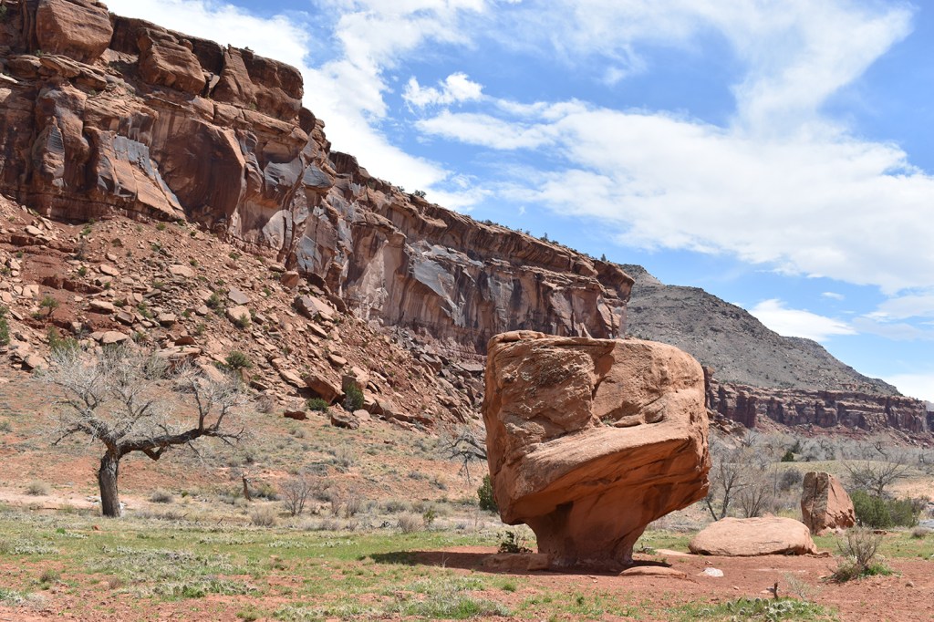 The large rock with the smaller base in the wash reminds me of Balanced Rock in Garden of the Gods in Colorado Springs, though Balanced Rock was “repaired” at least once to maintain its unique look. The power of water erosion is a wonder.