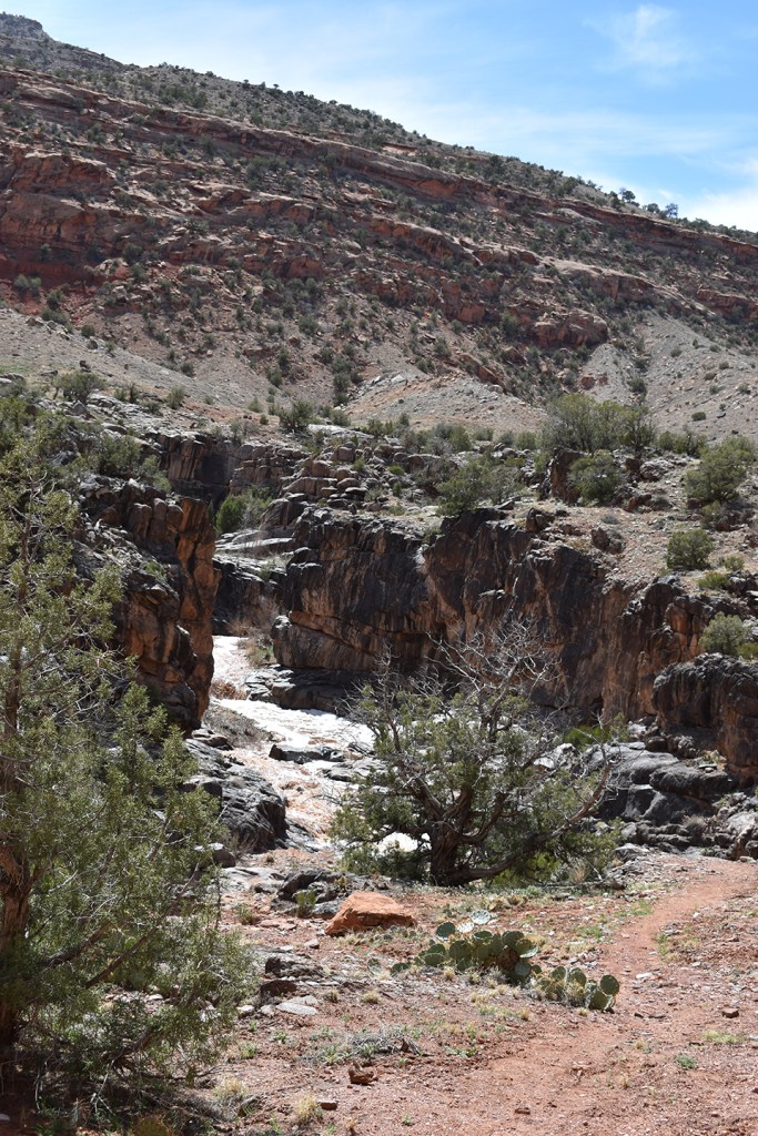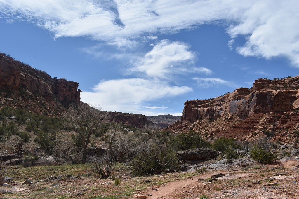 We followed the Big Dominguez trail that follows Big Dominguez Creek, a tributary to the Gunnison River, through the desert canyon for about six miles round trip under bright blue skies with wispy clouds, not steep but a slow rise. Our footsteps passed sagebrush, dry grasses, occasional yellow flowers, green cactus against the red earth, glimpses of the mostly brown water with a rocky tumble now and then, the reds and browns of the rock surfaces, so many different shades of red. For much of the hike, the only sound was our footsteps and, when nearby, the gurgle of the creek. A friend spotted a lizard, but I turned too late to catch him scurrying by.