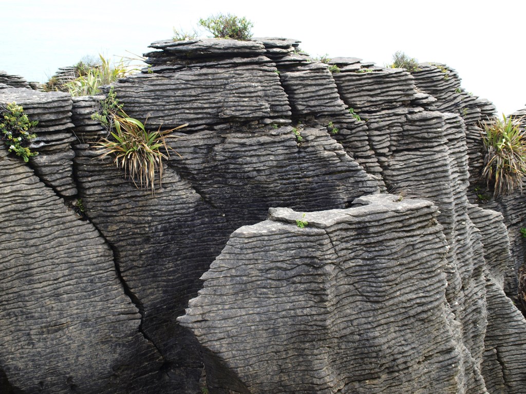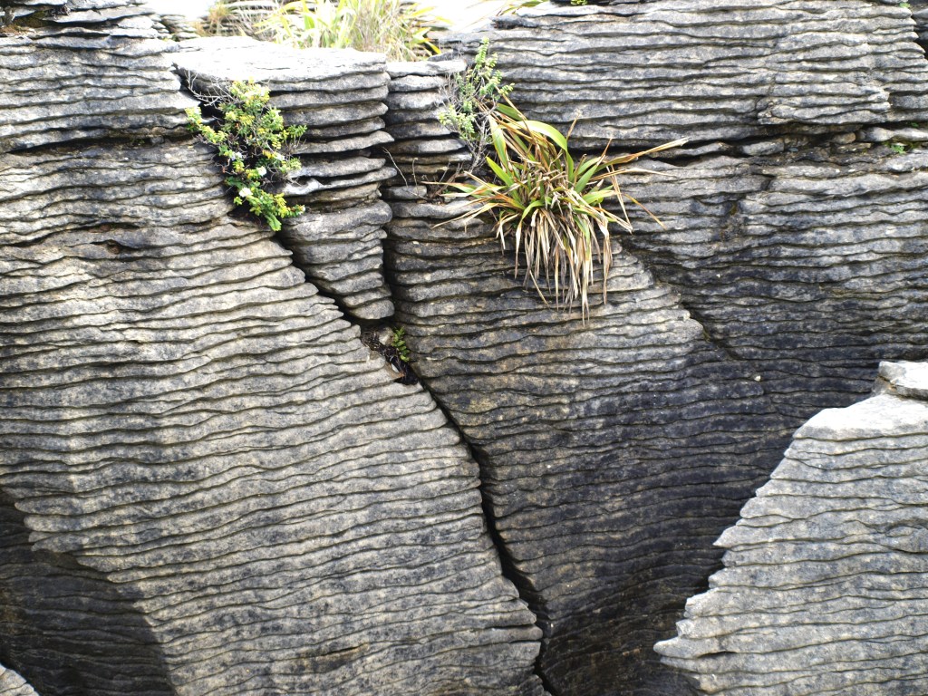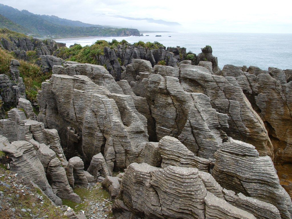 Our one planned stop was to see the unusual striated limestone formations at Punakaiki Pancake Rocks and take the short Blowholes Walk. The tides weren’t at their height, so the blowholes didn’t perform for us. Rather than try to explain this unique landform in my layman’s terms, here’s a quote from New Zealand’s Parks and Recreation website: