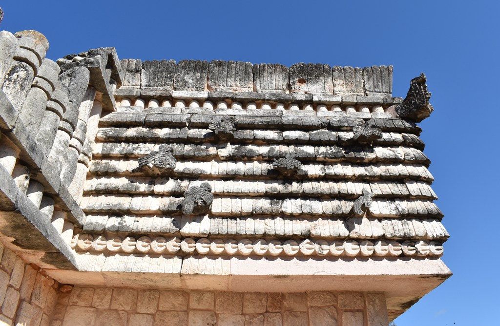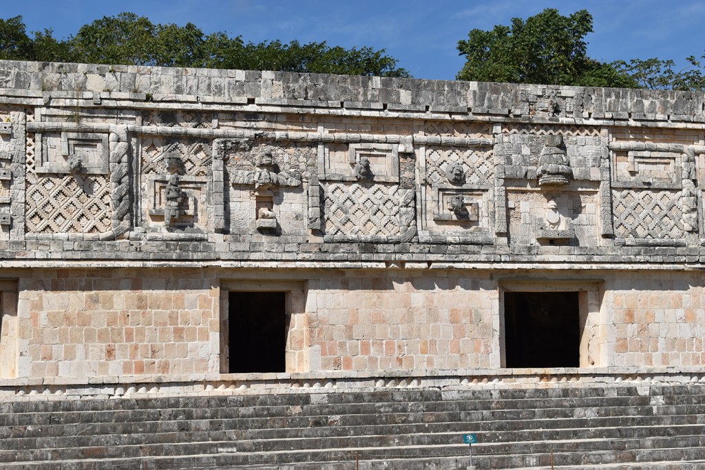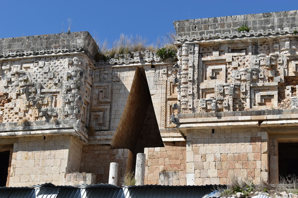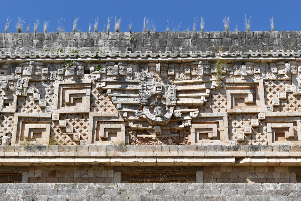 This Puuc style of architecture features a lower, plain wall section with the upper part decorated with geometric mosaics, serpents, masks of Chac, the rain god, and other figures.