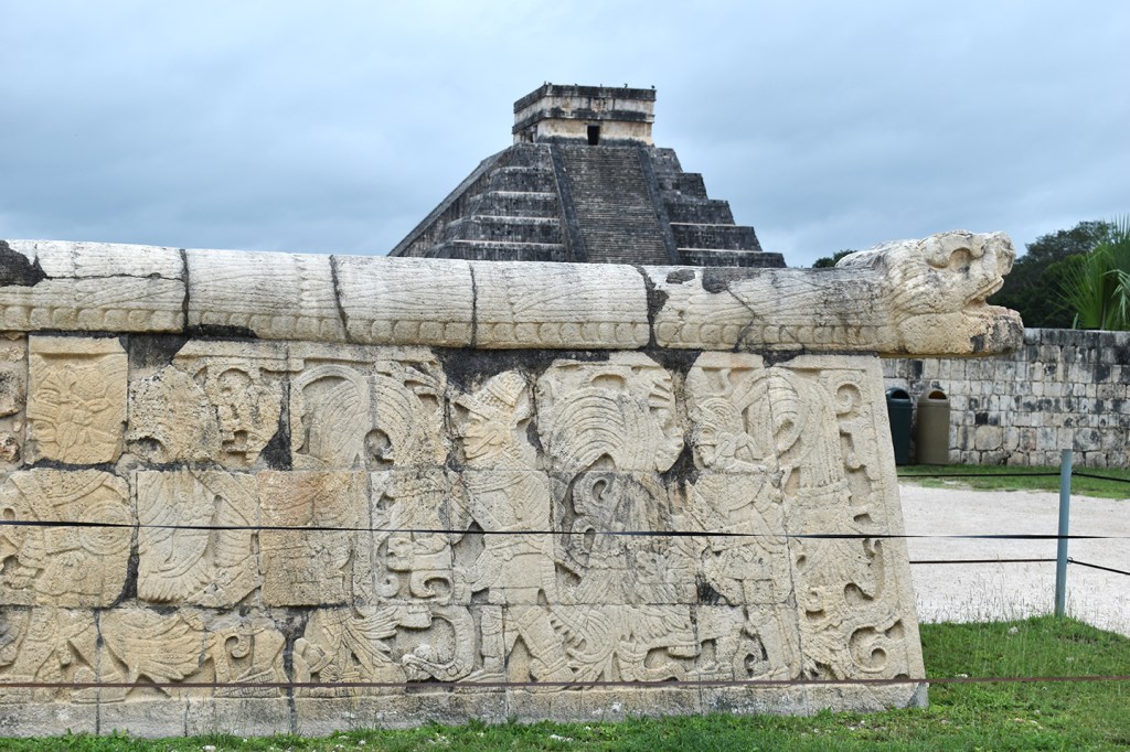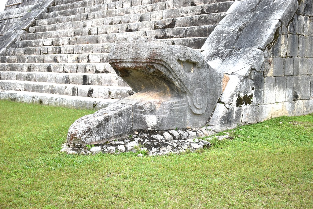 The famous El Castillo or The Castle pyramid, also known as the Temple of Kukulkán, the serpent deity, dominates the site, towering over a broad open area, which makes it look monumental. Climbing the pyramids is no longer allowed. Walking around the structure, serpents can be seen. There are many other buildings, including less developed areas. Intricate carvings on the structures tell stories of the Mayan past, the culture, gods, ceremonies, and people.