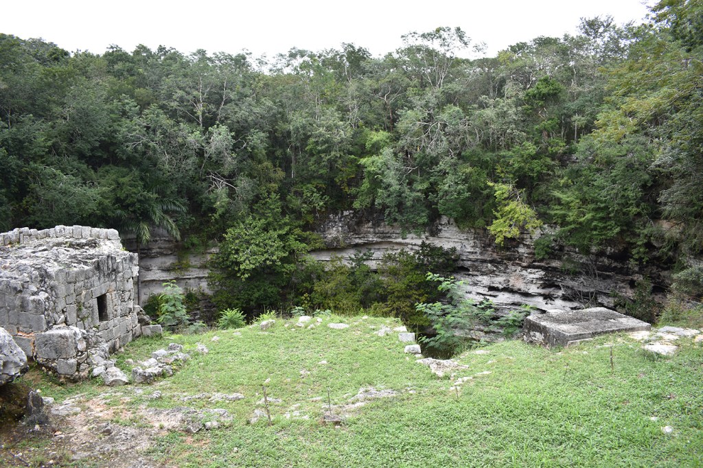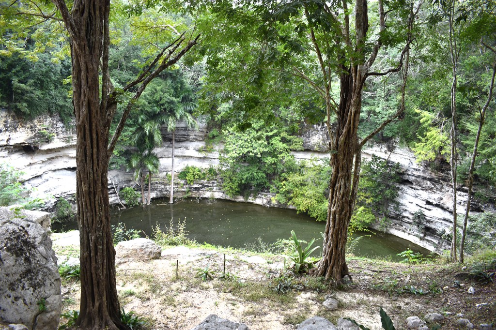 A cenote, a sinkhole pool, at the far end that may have been a collapsed cave, was sacred to the Mayans. Swimming is not permitted in this cenote. It was known as the home of the river god, Chaac. Bones of men, women, and children were found in the cenote with hands and feet bound, suggesting they were sacrificed. Artifacts of gold, jade, and obsidian were also found there.