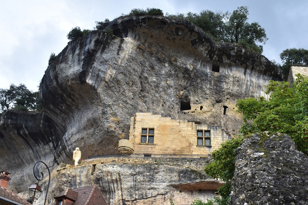 Up above the town, against monochrome streaked cliffs, sits the Musée National de Préhistoire, National Prehistory Museum, known for its extensive collection of millions of Paleolithic items. Outside the building stands a sculpture of Neanderthal “Primitive Man” by French sculptor Paul Darde. On a morning visit to the museum, having a local tour guide was helpful, to learn about the many stone tools, bone and ivory carvings, skeletons of Neanderthals, and other artifacts.